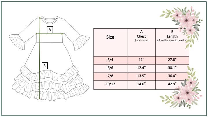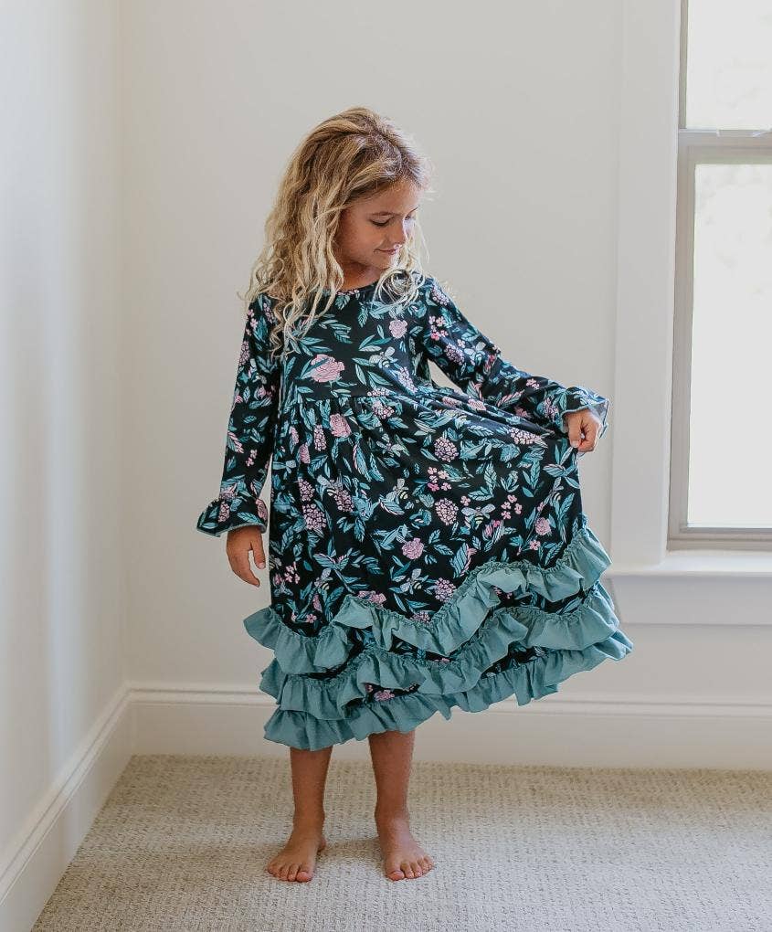 Girls Dusty blue & black floral print long sleeve dress with triple ruffle hem detail. Fabric is very soft and comfy with lots of stretch. Perfect for Fall & Winter!