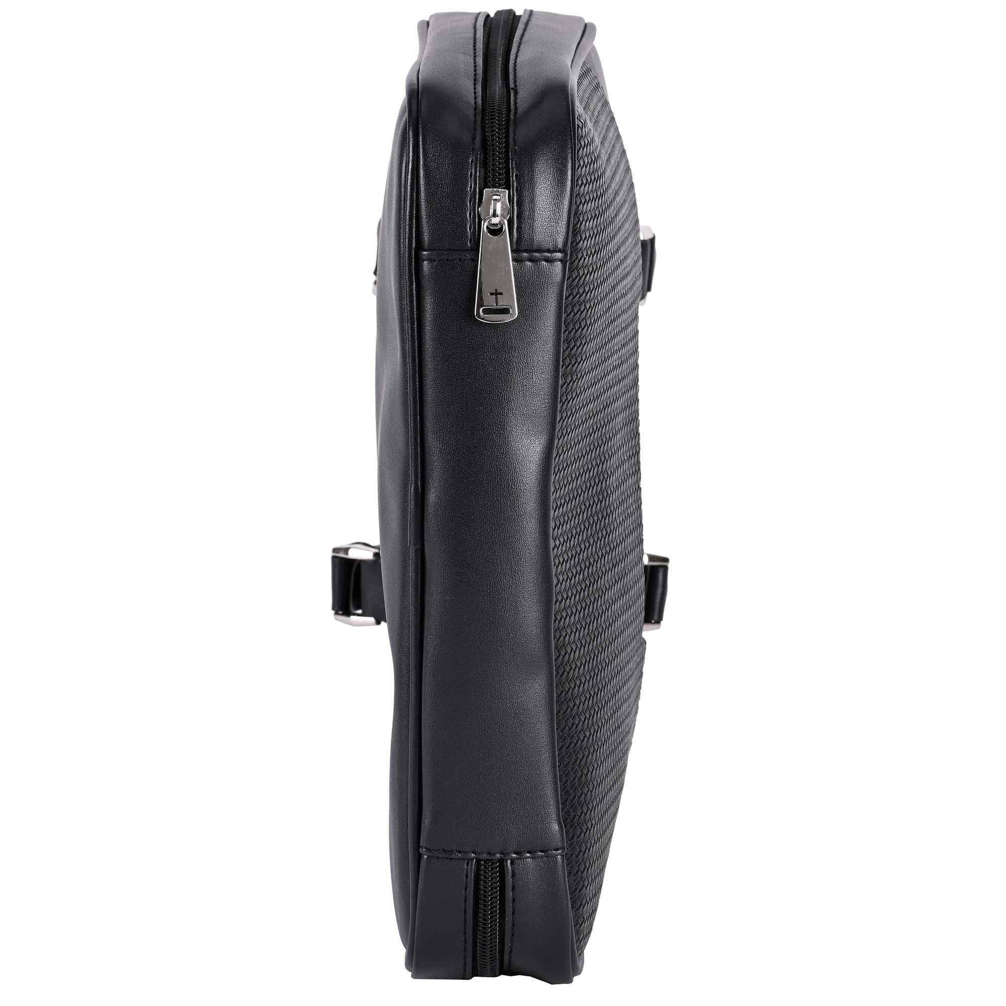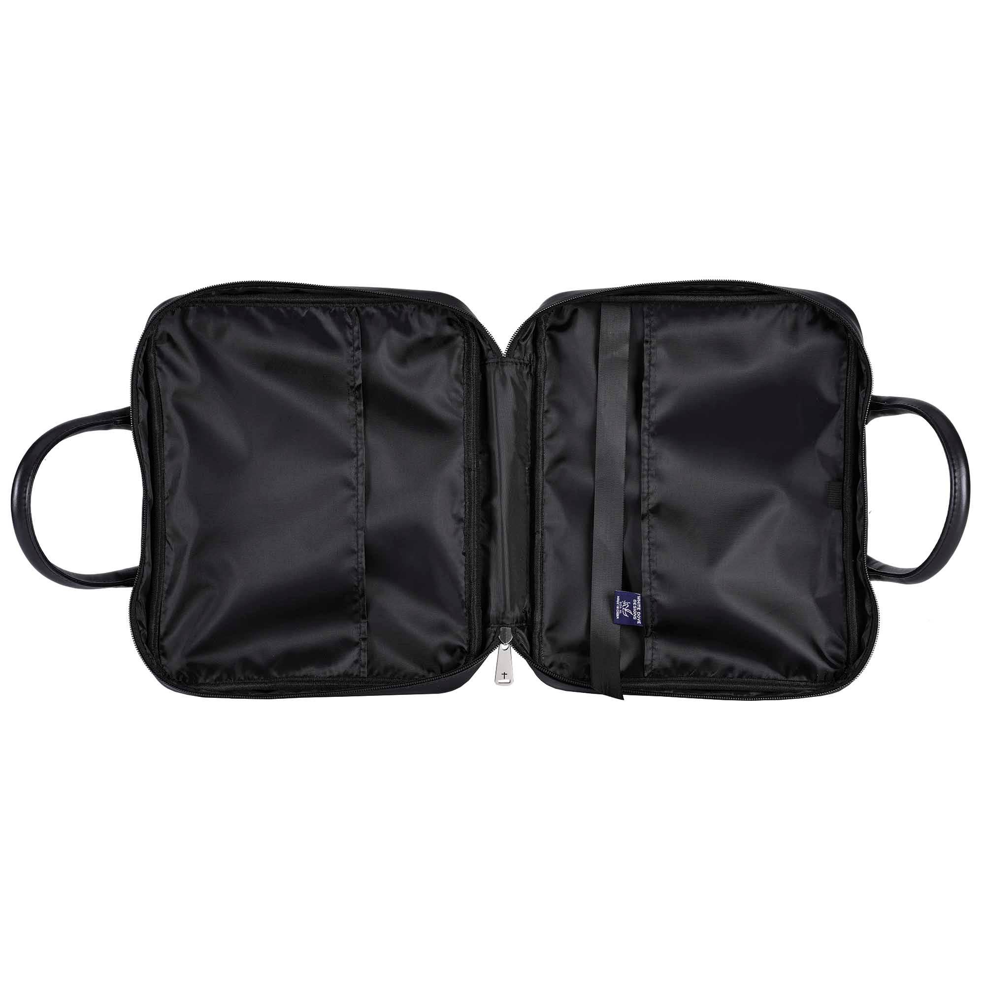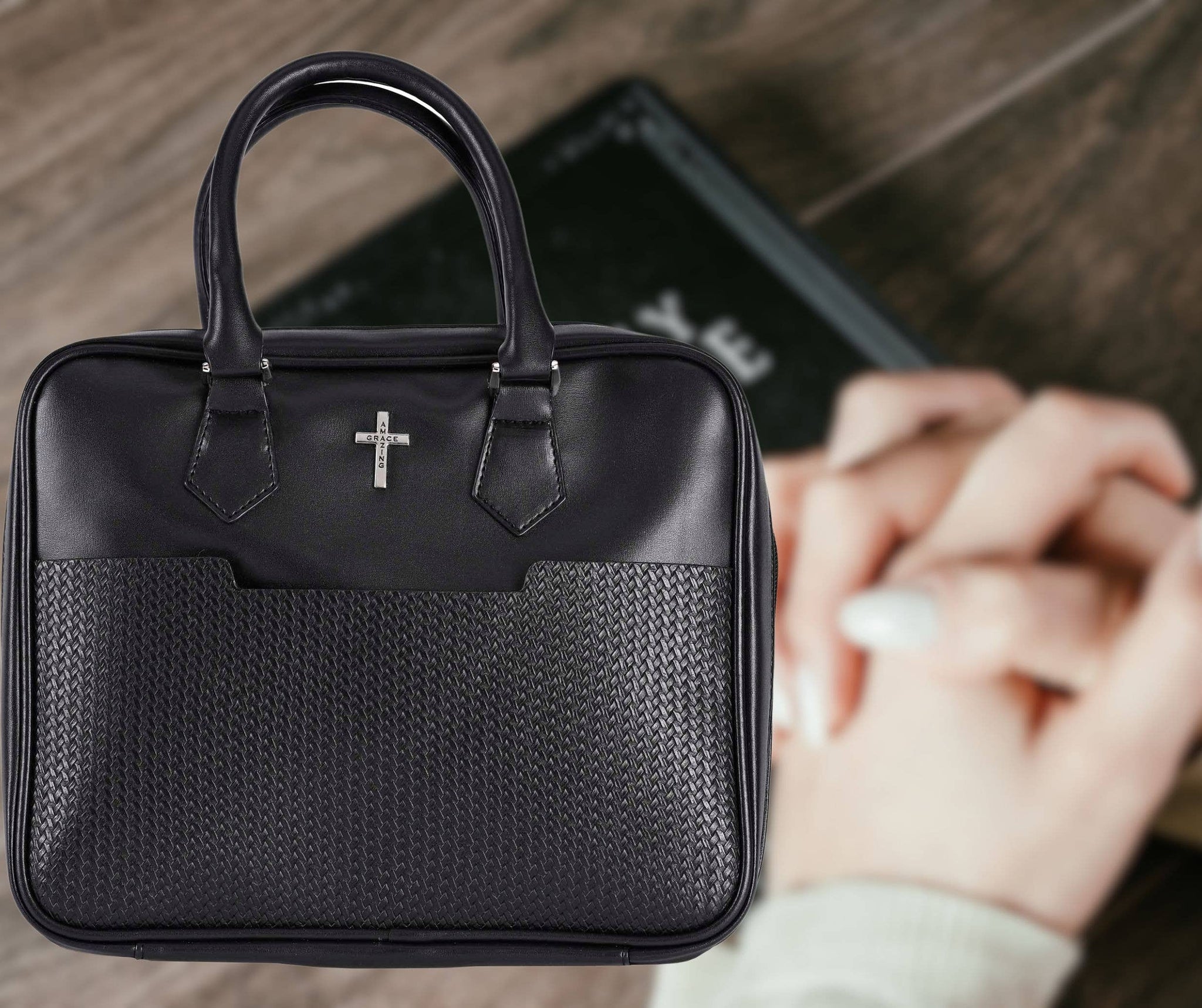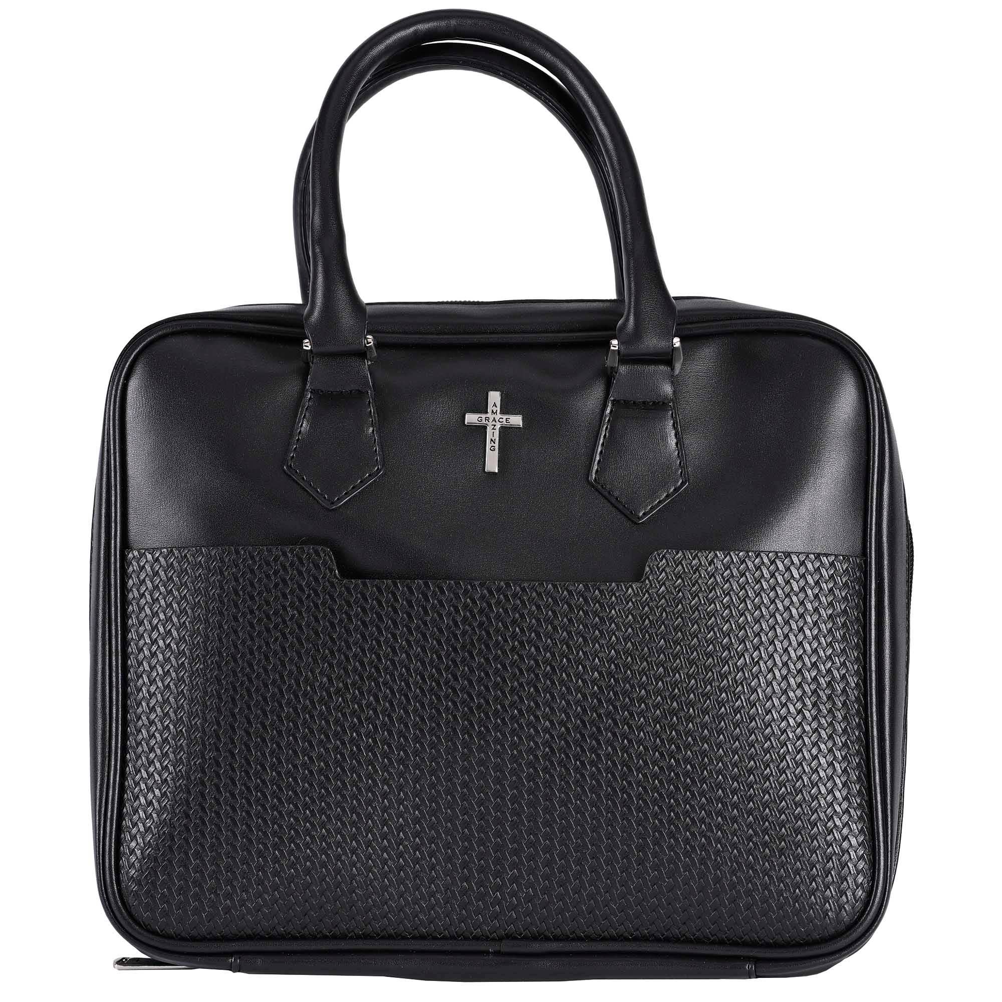 Handbag Style Black Polyurethane Bible Cover With Open Front Pocket With Basket-Weave Texture. The Front Features A Cross Plate With Text: Amazing Grace. Features Purse-Style Handles, A Cross Zipper Pull, Elastic Pen Loop And A Ribbon Bookmark. Approximate Xx-Large-Size Dimensions 11-1/2 X 2-3/4 X 9-1/2. White Dove design.