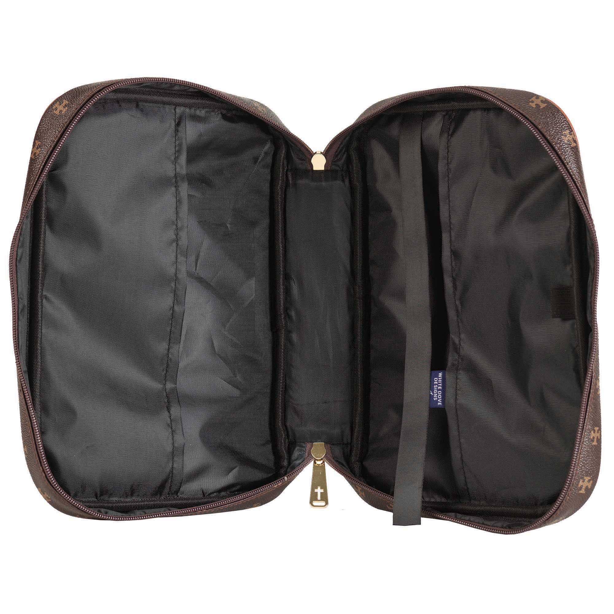 Faith Collection Cross And Heart Signature Polyurethane Bible Cover. Rectangle Shaped Brown Cover With Large Outside Pockets Inside Bookmark And Elastic Pen Loop. Cross Zipper Pull. Accommodates A Bible Or Book 9.75 X 1.75 X 6.75 White Dove design