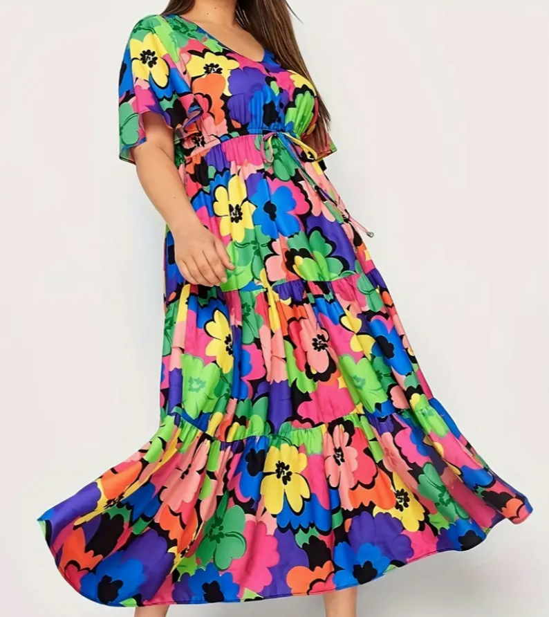 Tiered Polka Dot Print Short Sleeve Midi Dress (Plus Size)