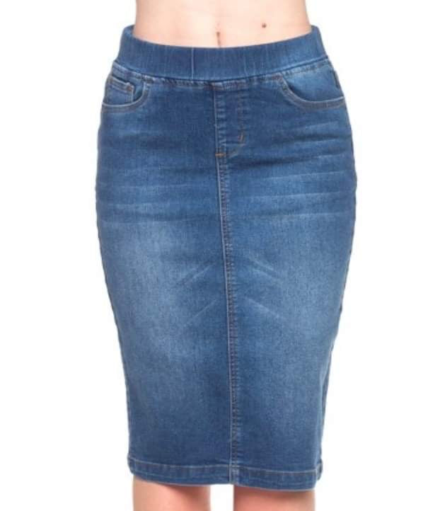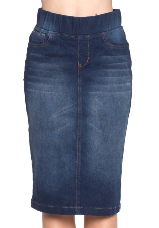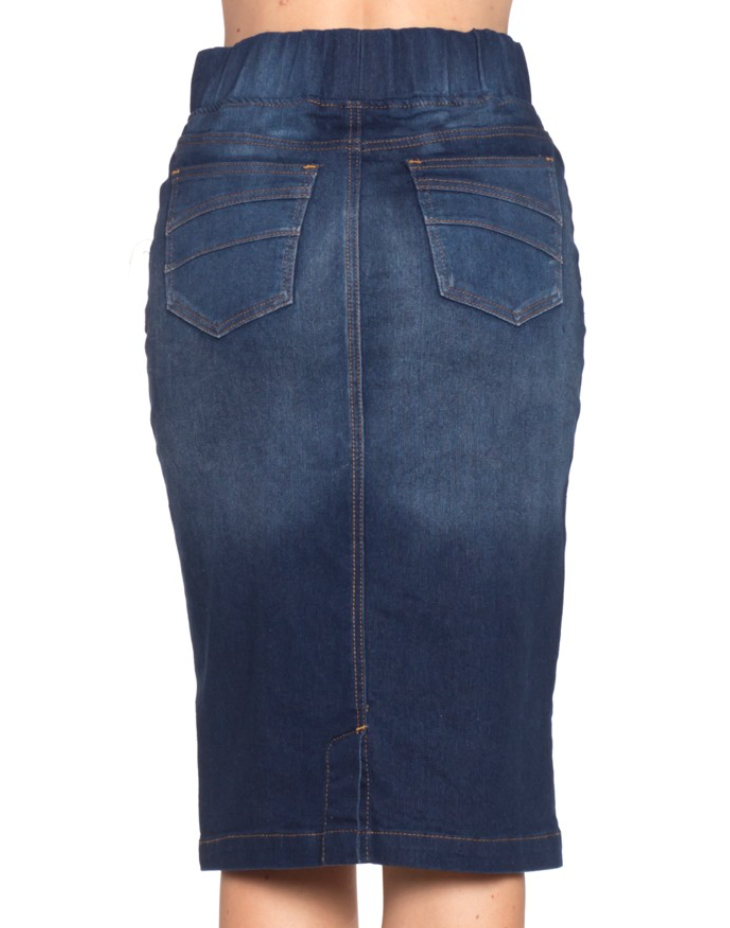 stretch denim middle-length pencil skirt with washed effect, elastic waistband, 4" back slit, back length 26".